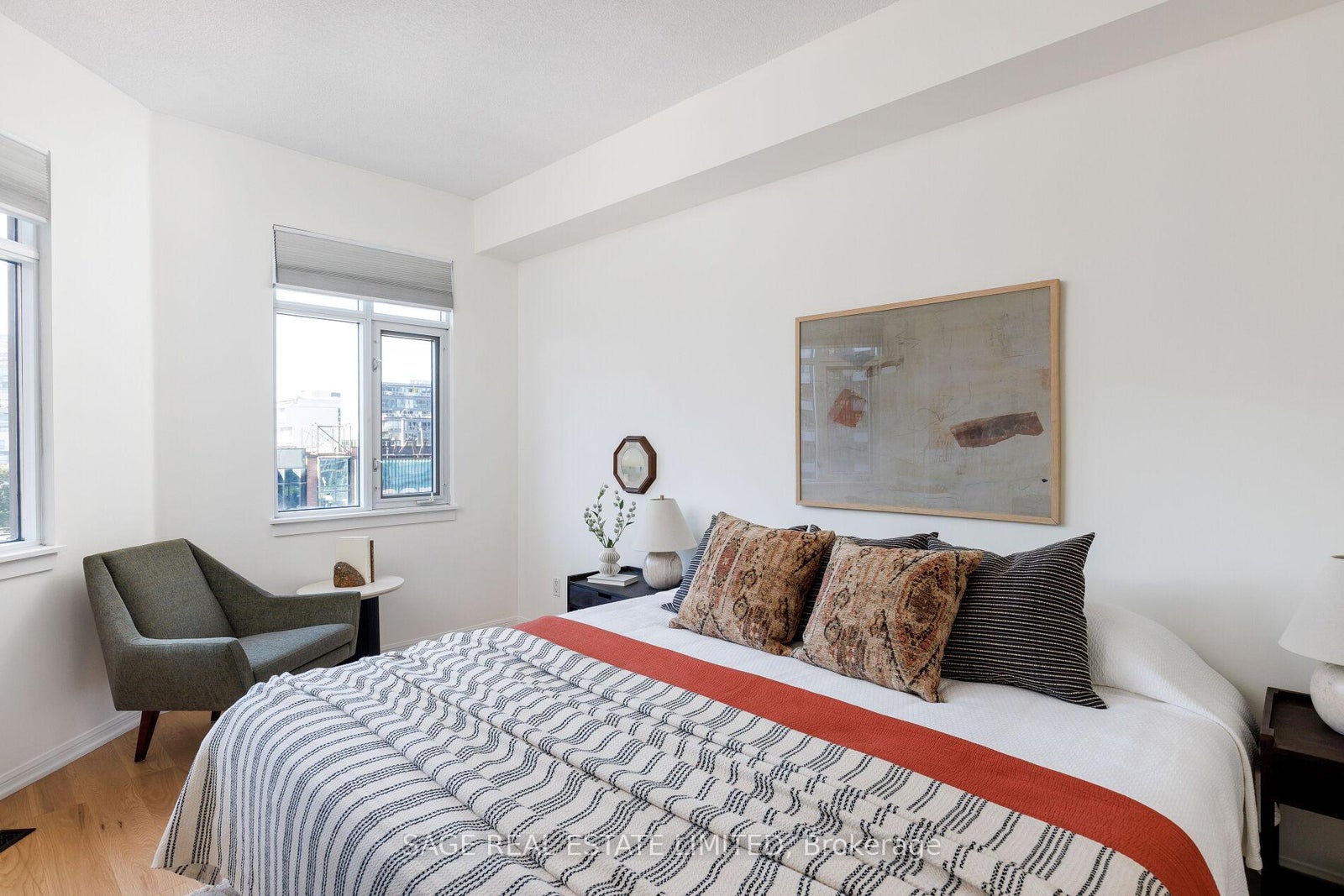 New Price! A house in the sky at Portland & Front. Suite 615 is perfectly laid out over 2-storeys, a dream floorplan for grown-up downtown living. Well managed midsize building with no elevator rush hours and a healthy proportion of owner-occupied suites. Come home to an 1106 sq ft exceptionally wide interior + large balcony overlooking a quiet courtyard. There are no pillars or columns getting in the way and no condo-sized furniture is needed - you can go full size on everything. Come home to a proper foyer and coat closet, ample space for both living and dining furnishings, a chef-friendly kitchen w/ bonus walk-in storage room, a coveted powder room for guests, and a double door walkout to a big balcony overlooking the courtyard. Impeccably updated with brand new honey wheat 5" plank engineered hardwood flooring throughout. Retire upstairs to 2 adult-sized bedrooms with king bed proportions, an open den / exercise area, and an extravagantly renovated spa getaway bathroom. Convenient laundry access upstairs as well. Freshly painted top to bottom. Abundant storage everywhere. Straddling King West and the Lake, with the Well just steps away, you could hardly be better situated to live your best life downtown.